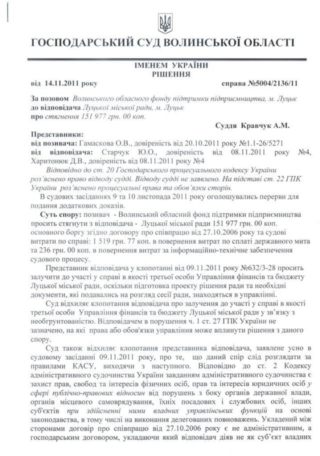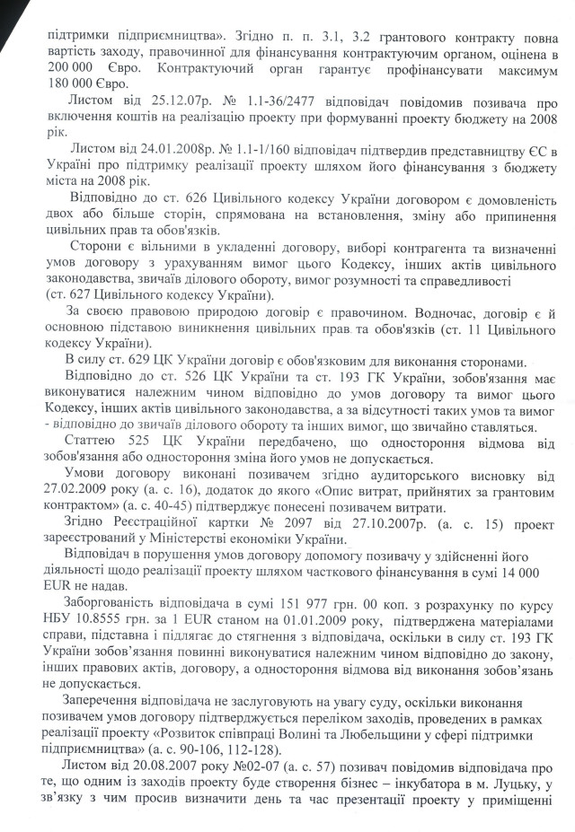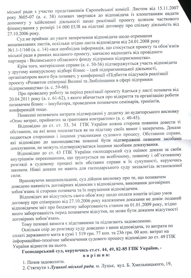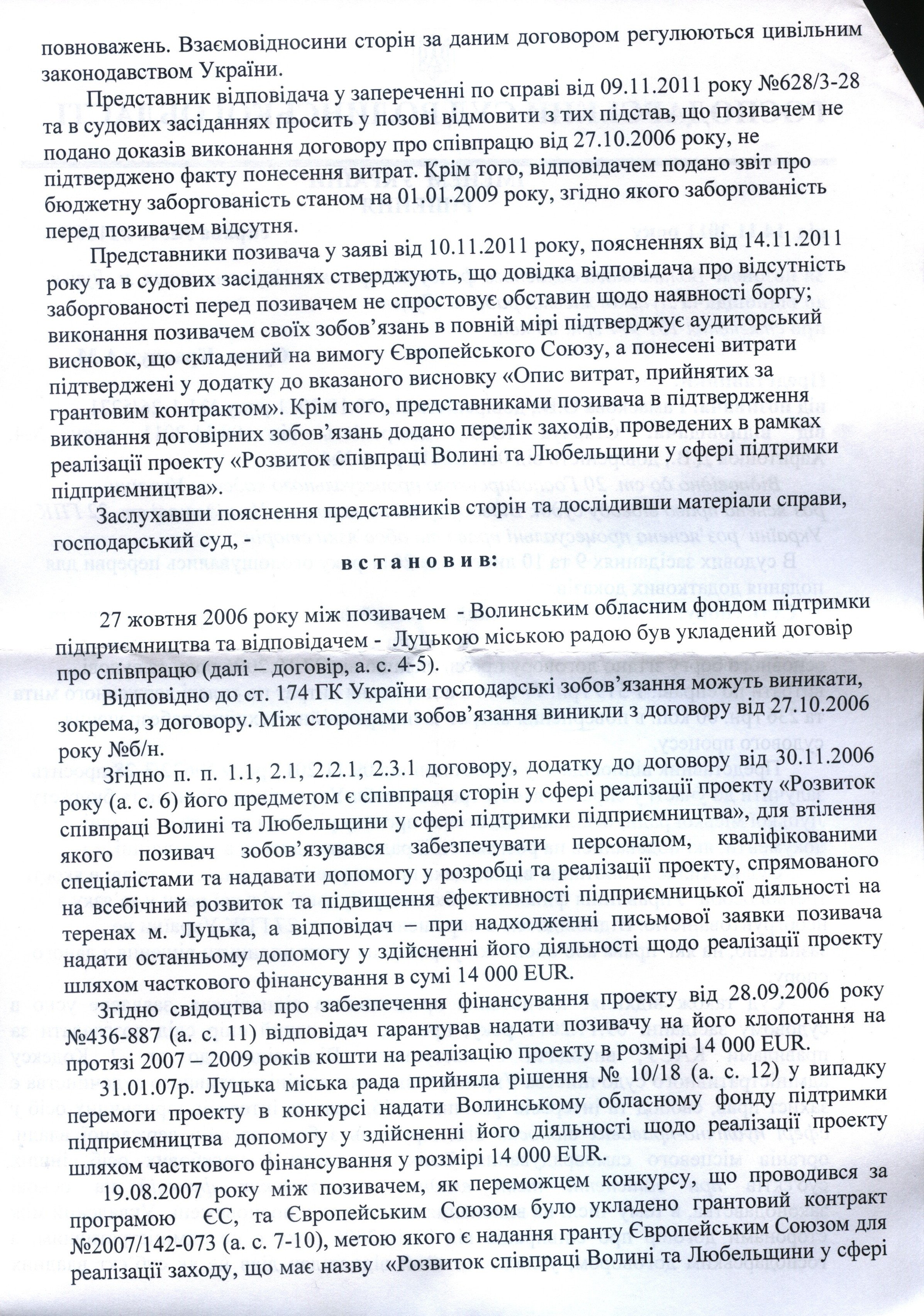 «Проект був реалізований, фонд отримав кошти від ЄС в сумі 180 тисяч євро. …Однак Луцька міська рада свого зобов’язання про надання фонду 14 000 євро не виконала, що стало причиною нашого звернення з позовом до суду. Рішенням суду від 14 листопада 2011 року позов про стягнення 151 977 грн. було задоволено. Луцька міська рада оскаржила рішення суду в апеляційну інстанцію. 17 січня 2012 року в судовому рішенні Луцька міська рада підтримала апеляційну скаргу і вимагає скасування рішення суду першої інстанції та відмови у позові», ‒ йдеться у листі фонду.