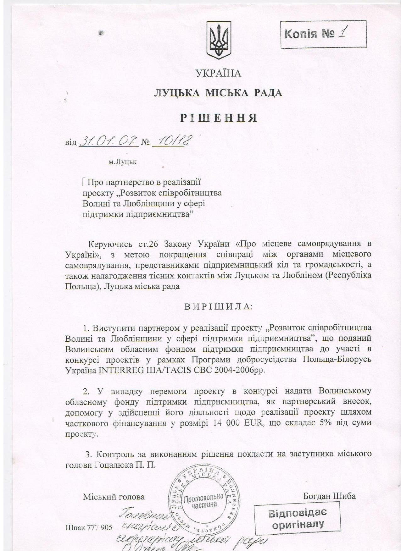 Також варто зазначити, що у переліку рішень десятої сесії Луцької міської ради 5 скликання є рішення «Про партнерство в реалізації проекту «Розвиток співробітництва Волині та Люблінщини у сфері підтримки підприємництва» від 31.01.2007 №10/18.