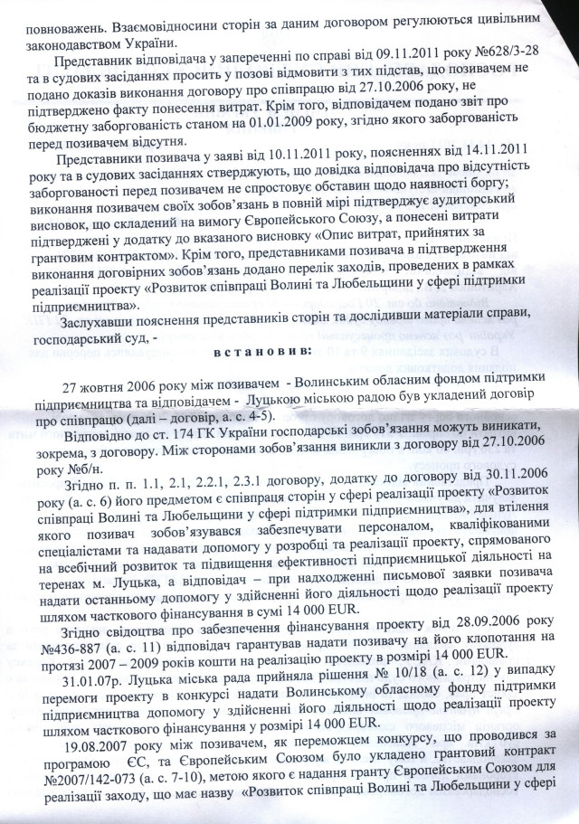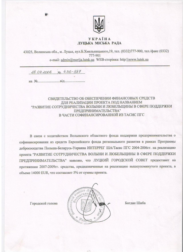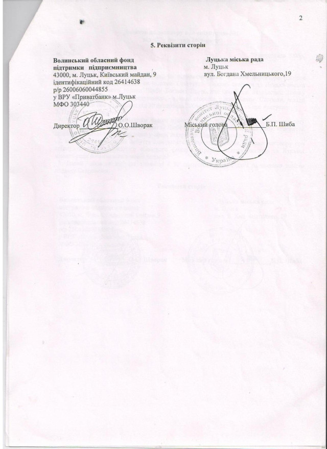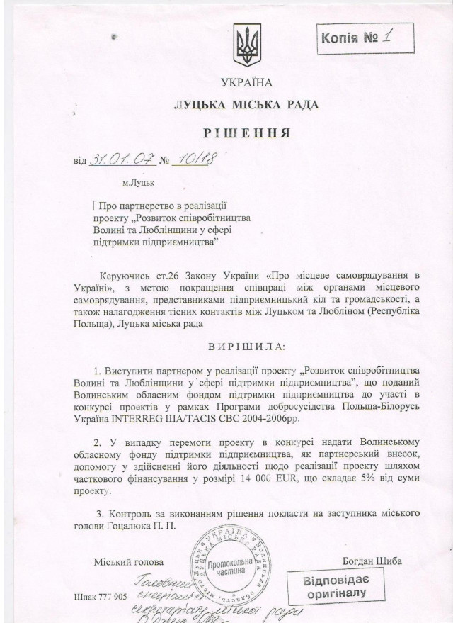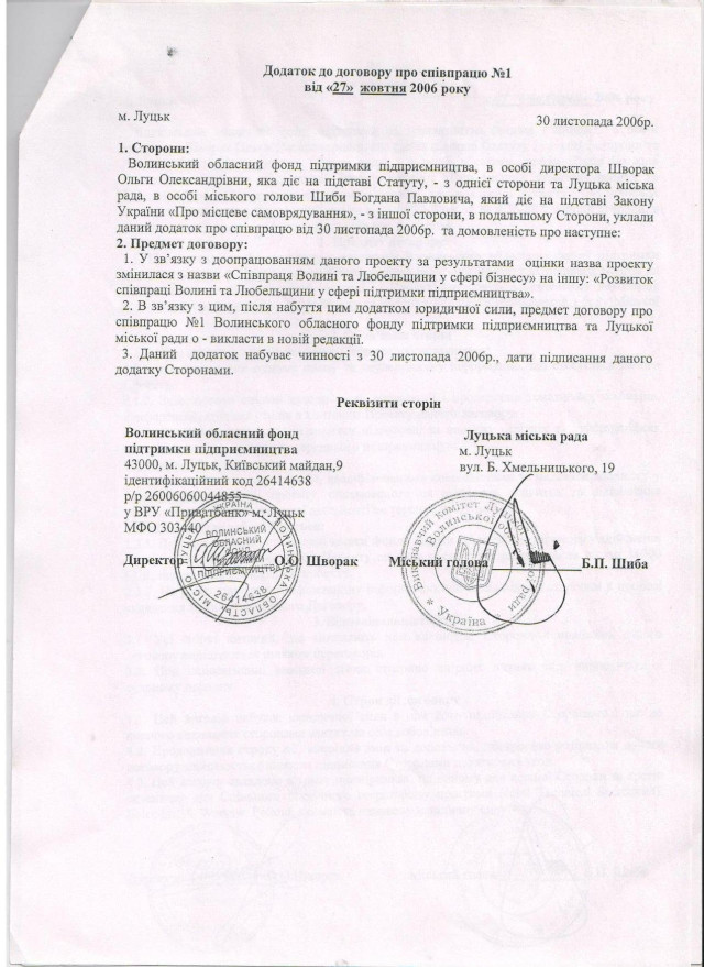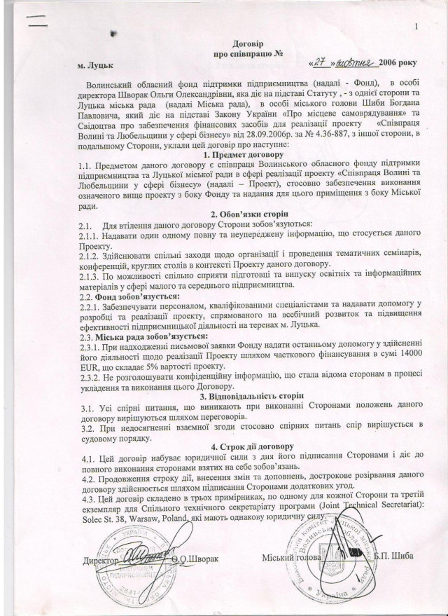 Як ідеться в документі, 27 жовтня 2006 року між Волинським обласним фондом підтримки підприємництва і Луцькою міською радою був укладений договір про співпрацю в реалізації проекту. Цей проект фонд реалізовував на гроші Євросоюзу, а Луцька міська рада брала на себе зобов’язання частково фінансувати проект. Для цього міськрада повинна була надати фонду 14 тисяч євро.