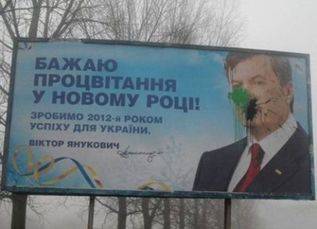 А днями в Інтернеті з’явився відеоролик, на якому невідомі закидали фарбою фотографію Президента Віктора Януковича на білборді з його новорічниим привітанням. У зв’язку з цим львівська міліція порушила кримінальну справу.