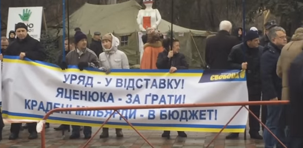 Як повідомляє УНІАН, люди з однієї групи тримають у руках прапори із символікою ВО "Свобода", державні прапори України та один прапор "Правого сектору". Вони також тримають транспаранти з гаслами: "Уряд — у відставку!", "Яценюка — за ґрати!", "Крадені мільярди — в бюджет!". Особи з іншої групи тримають у руках прапори із написом "Партія простих людей". Ця група має невелику пересувну сцену, з якої лунає музика. Також деякі з учасників акції б'ють у залізні діжки. Серед гасел цієї групи – вимога про відставку уряду.