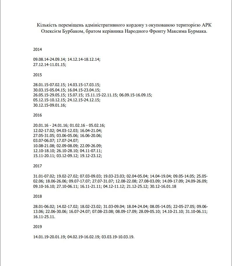 «Майже у всі дні, коли на Донбасі гинули українські солдати, сім’я лідера фракції «Народний фронт» Максима Бурбака безперешкодно відвідувала окупований Крим. Протягом 5 років війни, рідний брат Максима Бурбака та однокласник Арсенія Яценюка Олексій Бурбак 75 разів перетинав кордон з окупованим Кримом.