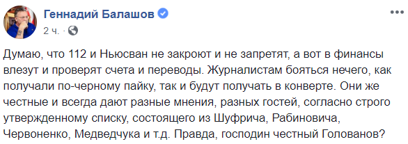 "Думаю, що 112 і Ньюсван не закриють і не заборонять, а ось в фінанси влізуть і перевірять рахунки і перекази", - думає політик Геннадій Балашов.