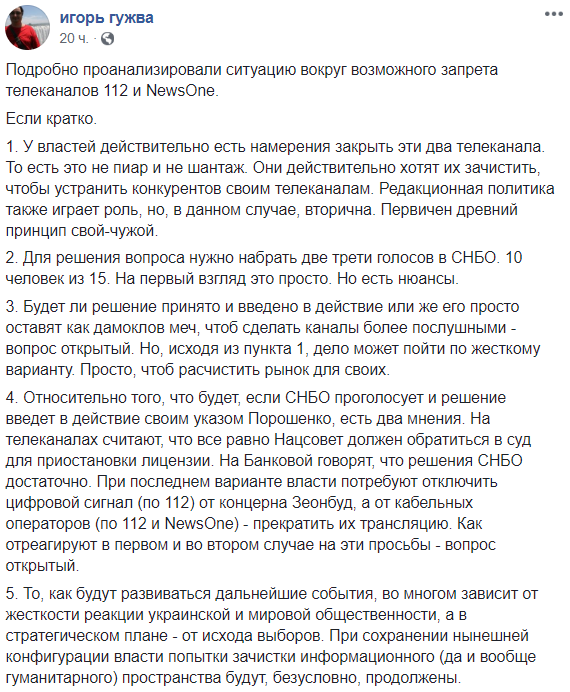 У той же час Ігор Гужва вважає, що канали дійсно можуть закрити. І зараз це залежить лише від громадського резонансу, який підніме ця тема. Тільки він може збити спробу закриття ТВ-кнопок.