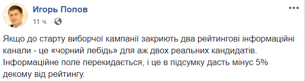 "Якщо до старту виборчої кампанії закриють два рейтингові інформаційні канали - це «чорний лебідь» для аж двох реальних кандидатів. Інформаційне поле перекидається, і це в підсумку дасть мінус 5% декому від рейтингу", - передрікає нардеп Ігор Попов.