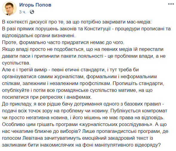 "Вконтексті дискусії про те, за що потрібно закривати мас-медіа: В разі прямих порушень законів та Конституції - процедури прописані та відповідальні органи визначені. Проте, формально часто придратися немає до чого. Якщо владі просто не подобається, що на певних медіа їй перестали давати паси і припинили пакети лояльності - це проблеми влади, а не суспільства. Але є і третій вимір - певні етичні стандарти, і тут треба би організуватися самим журналістам, формальним і неформальним спілкам, залежним і незалежним профспілкам. Пропишіть стандарти, опублікуйте і потім все громадянське суспільство матиме, на що посилатися при репресіях і анафемах. До прикладу, я все рідше бачу дотримання одного з базових правил - подачі всіх точок зору на проблему чи новину. Публікується компромат чи просто негативна новина, і його мішень не має права на відповідь. Особливо цим грішать програми «журналістських розслідувань». А що нас чекатиме ближче до виборів? Лише пропагандистські програми, де голосом Левітана зачитуватимуть емоційний закадровий текст із закликами бити інакомислячих на фоні маніпулятивного відеоряду?", - задається питанням нардеп Попов.