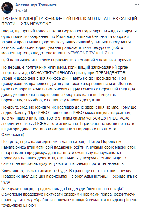 "Ніяких юридичних наслідків це звернення (Ради - ред. ) Не має. Тому що, відповідно до Закону" Про РНБО "тільки член РНБО може ініціювати розгляд того чи іншого питання. Тобто з таким же успіхом в РНБО може звернутися будь-яке ОСББ по того самого питання. І цей факт не могли не знати ініціатори цієї постанови ", - пише в Facebook юрист Олександр Трохимець.