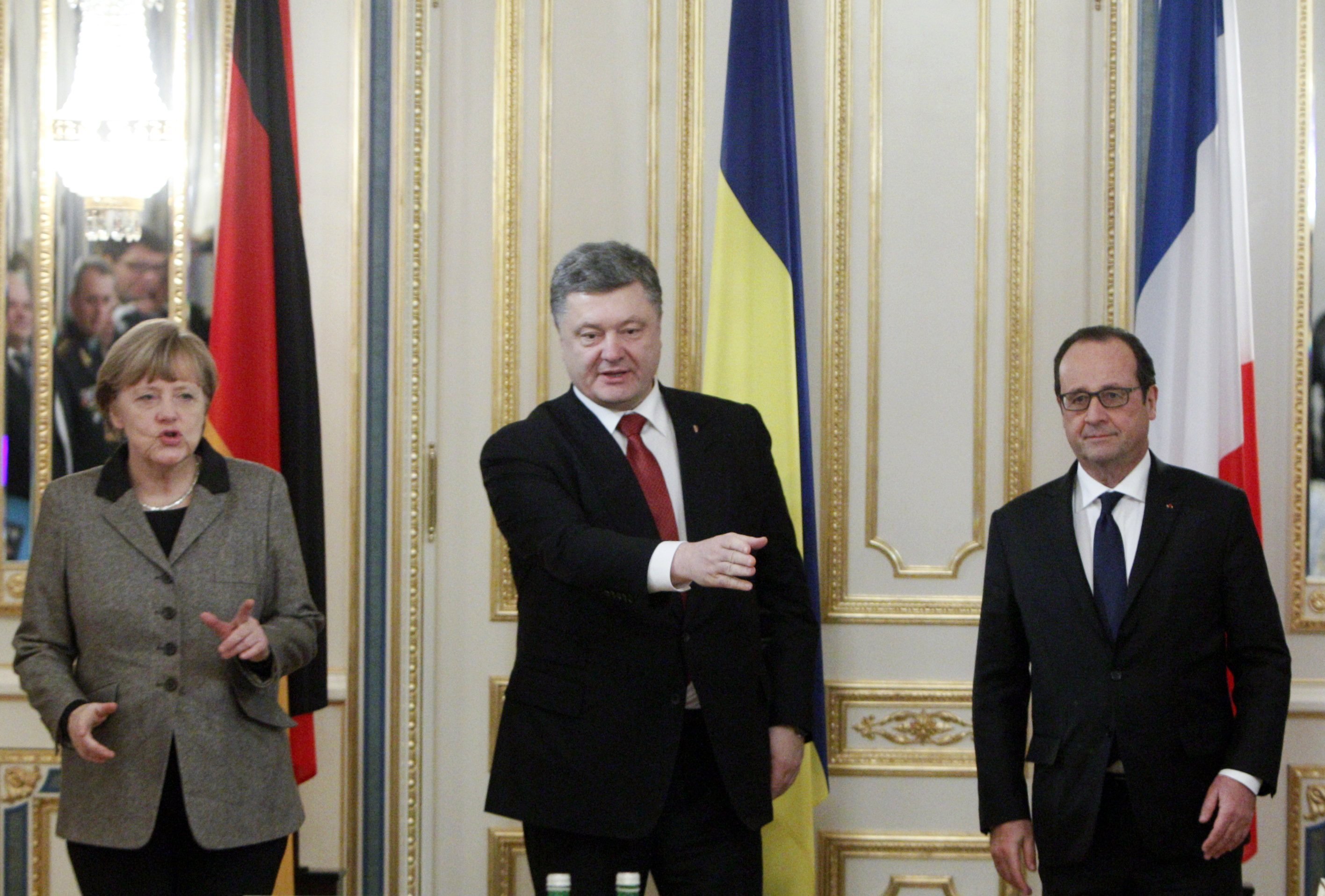 Керівники Німеччини і Франції вчора відвідали Київ і зустрілися з президентом Петром Порошенком. Після зустрічі міністр закордонних справ Павло Клімкін заявив, що зустріч «пройшла добре», і додав: «На Україну не тиснуть. Франція і Німеччина нам допомагають повернути мир». За його словами, керівники трьох держав «обговорили кроки, щоб Мінські домовленості запрацювали» повністю.