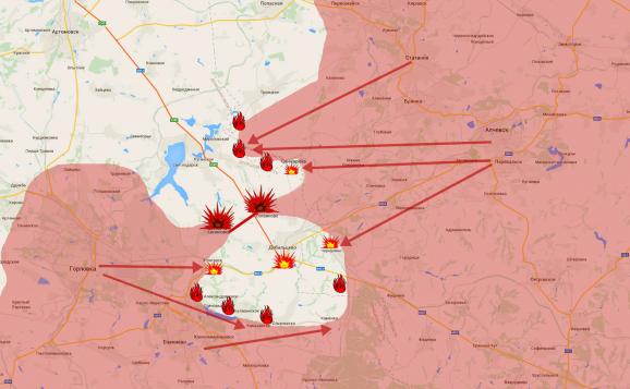 Наразі боротьба точиться біля неселених пунктів Логвинове та Калинівки, які примикають до стратегічно важливої траси Артемівськ-Дебальцеве, яка є єдиною артерією, що поєднує Дебальцеве з українськими силами.