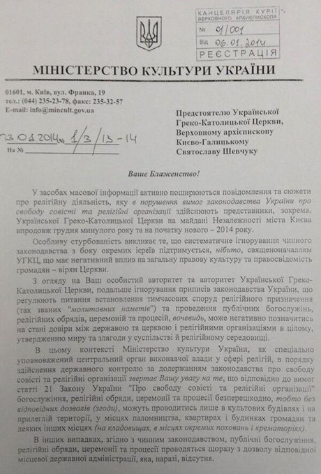 Предстоятель розповів, що УГКЦ отримала від Мінкульту лист з попередженням, а фактично, погрозами. «Доволі цікаво, що в цьому листі вперше за всі роки існування незалежної України прозвучало попередження, і можна навіть назвати його погрозою, про те, що релігійні громади УГКЦ в судовому порядку можуть бути позбавлені легального статусу», - розповів Святослав. «Ми думали, що час, коли переслідували церкву, уже давно минув», - обурився він. З його слів, приводом до звернення Мінкульту стала участь священників у протестах громадян. «Приводом є сам факт, що частина духовенства є серед вірних, які спонтанно вийшли на мирні протести», - розповів Святослав.