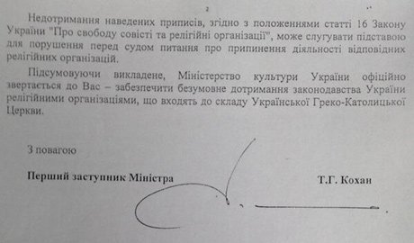Своєю чергою, предстоятель Української православної церкви Київського патріархату патріарх Філарет сказав, що в УПЦ КП листа від Міністерства культури не отримували, - повідомляє «Радіо Свобода».