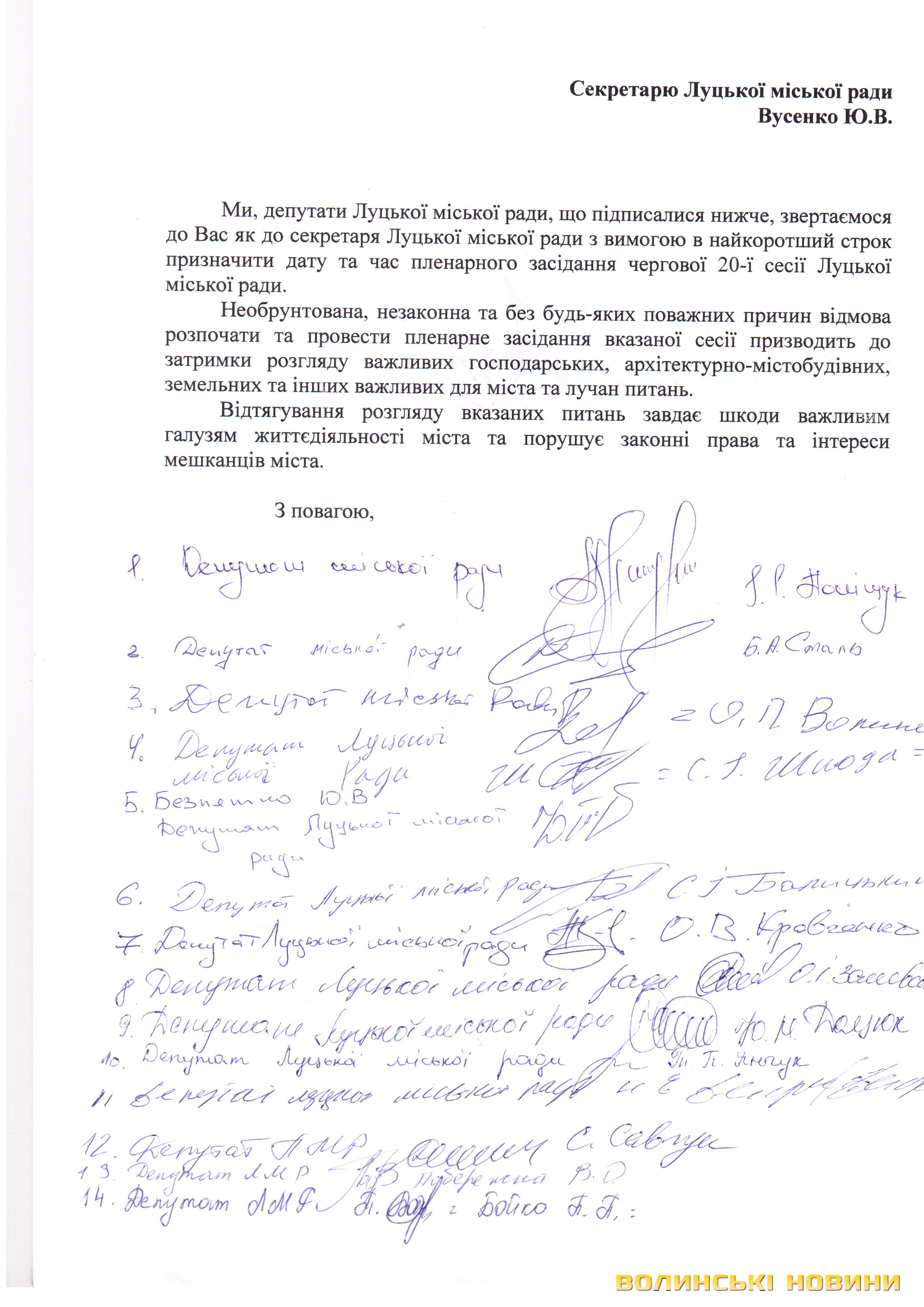 Як йдеться в зверненні, яке підписали 24 депутати, необґрунтована та незаконна відмова розпочати та провести пленарне засідання вказаної сесії призводить до затримки розгляду важливих господарських, архітектурно-містобудівних, земельних та інших важливих для лучан питань.