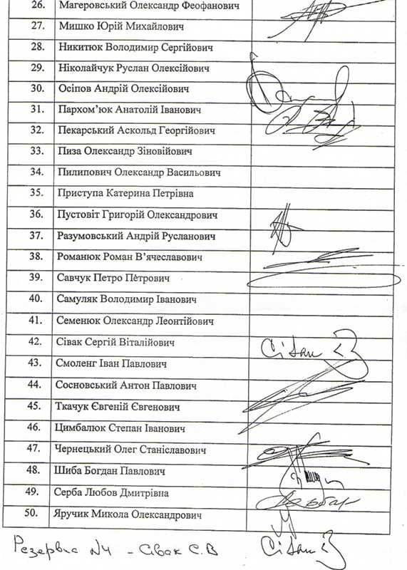 Були присутні повністю – у складі двох чоловік «Наша Україна», майже уся «Свобода» та частина «Батьківщини». З фракції «Європейської партії» прийшов на засідання Анатолій Бірюков, а з «Фронт змін» Микола Дендіберін.