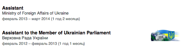 Також свою роботу помічником депутата дівчина підтвердила в своєму профілі на linkedin.com. Ще вона вказала, що понад рік працювала в МЗС України асистентом міністра якраз в той час, коли відомство очолював Леонід Кожара.