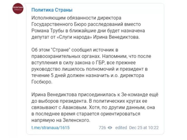 Тимчасово виконуючим обов’язки директора Державного бюро розслідувань замість Романа Труби буде призначена депутат від «Слуги народу» Ірина Венедиктова.