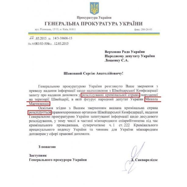Нагадаємо, Федеральна прокуратура Швейцарії звернулася до України і Чехії із запитом про надання правової допомоги у рамках розслідування кримінальної справи проти Миколи Мартиненка. Депутата підозрюють у корупції.Зі слів Лещенка, в ГПУ підтвердили отримання запиту з Швейцарії про надання правової допомоги у справі про отримання хабарів близьким соратником прем'єр-міністра Арсенія Яценюка.