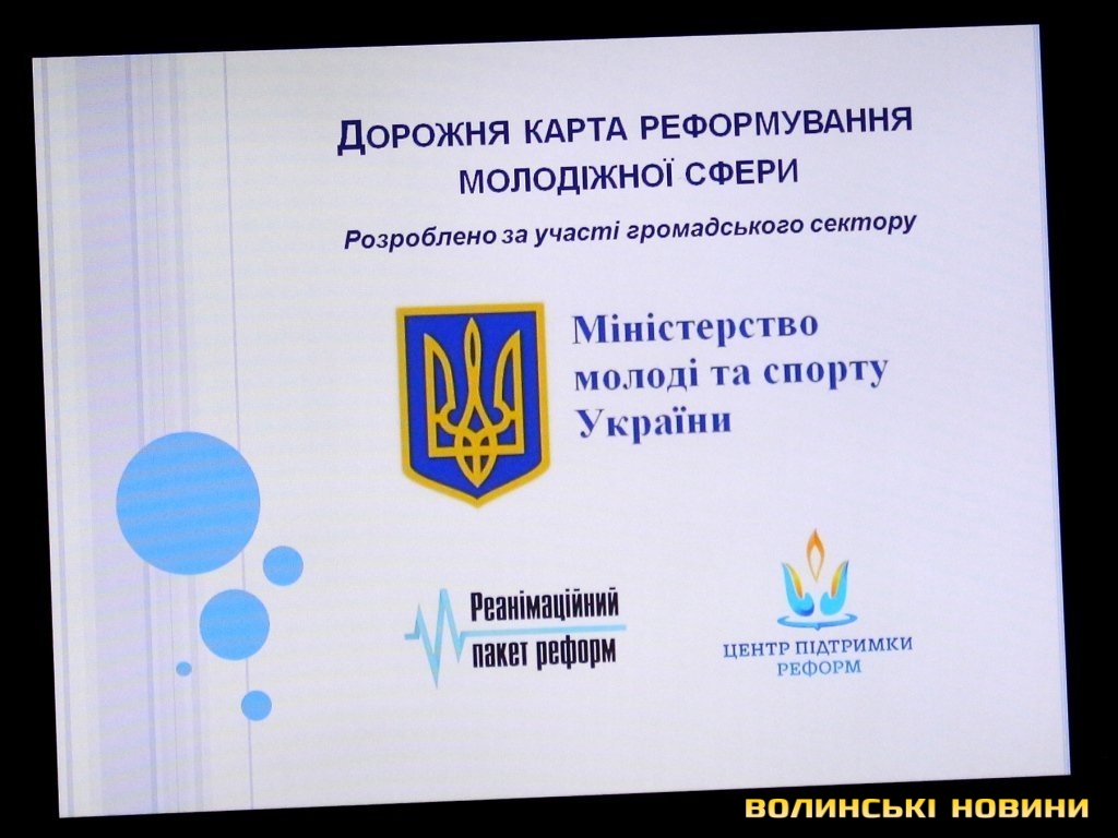 Заступник Міністра, презентуючи дорожню карту реформування молодіжної сфери, повідомив, що лише 5% молодих українців залучені у суспільні процеси. Реформа передбачає, зокрема, створення нових інструментів громадянської освіти. Він визнав, що наразі в Україні немає інфраструктури молодіжної політики.