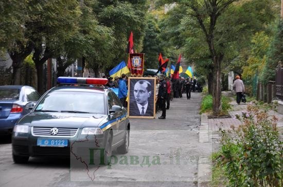 Попереду колони учасники маршу несли великий розтягнутий Державний прапор України та тримали в руках червоно-чорний стяг УПА, а також портрет лідера ОУН Степана Бандери.