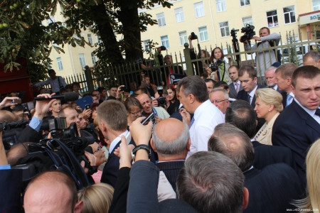 Після відвідин Волинської обласної клінічної лікарні Президент вирішив поспілкуватися з лучанами. Мешканці міста знімали Президента на мобільні телефони та намагалися ставити найрізноманітніші питання.