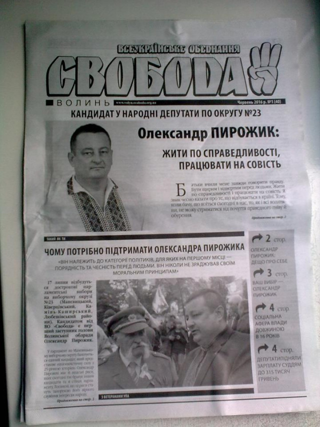 У виборчому окрузі № 23 зафіксували поширення агітаторами політичної партії «Свобода» агітаційних газет, у яких міститься інформація про кандидата у народні депутати Олександра Пирожика.