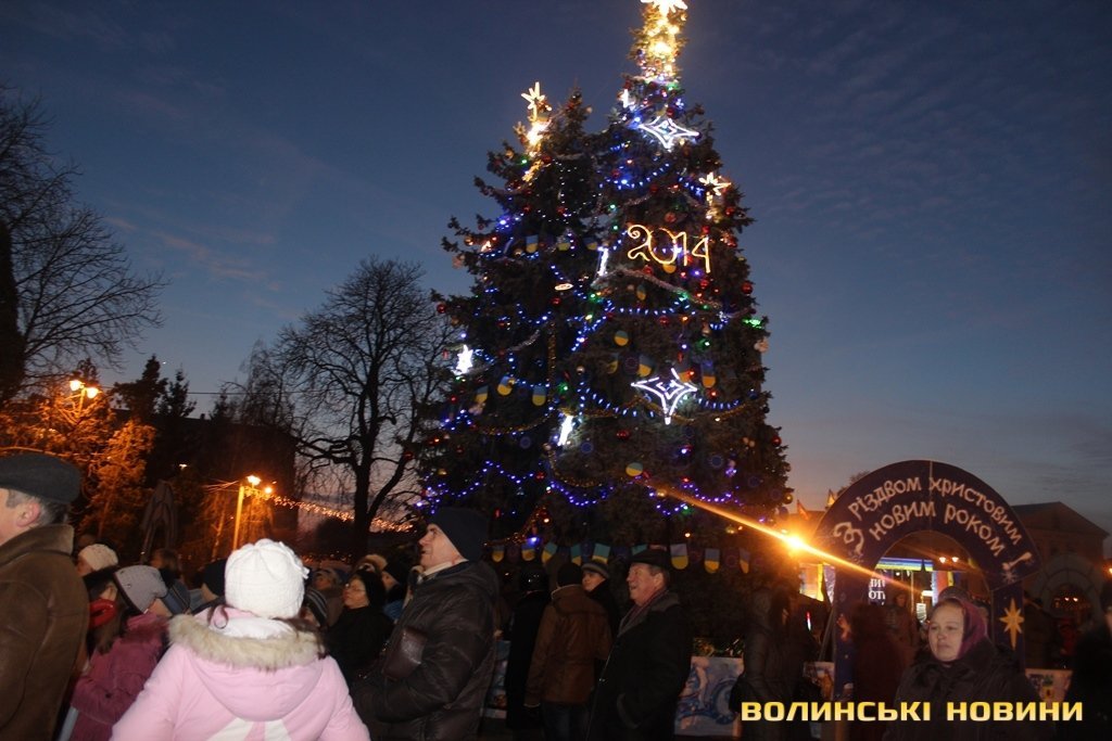 Цьогоріч трійцю живих ялинок на Театральному майдані в Луцьку прикрасили не тільки іграшками, а й символікою України та Євросоюзу. Аби облаштувати новорічне містечко, активісти Євромайдану пішли назустріч міській владі і частково перенесли намети.