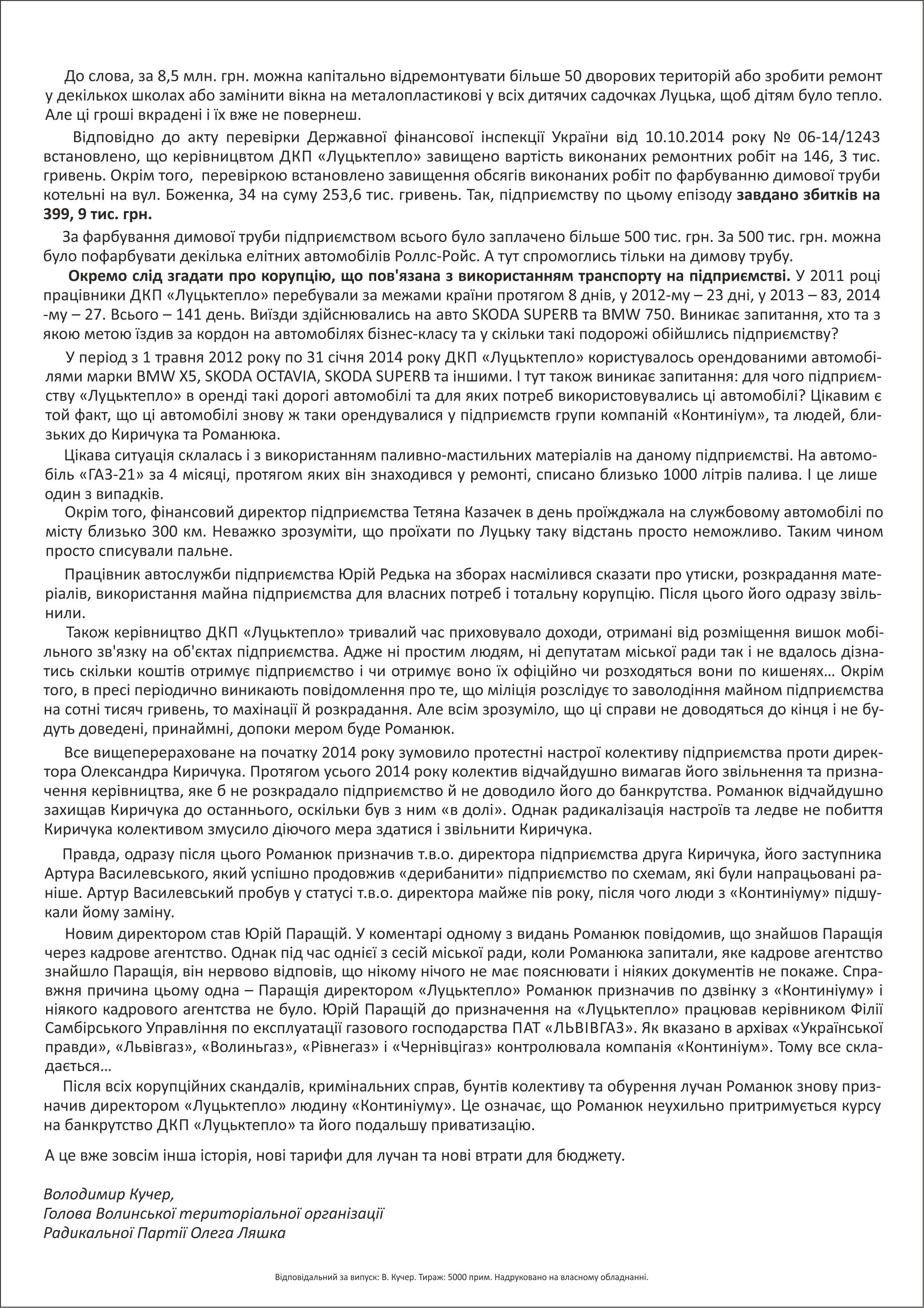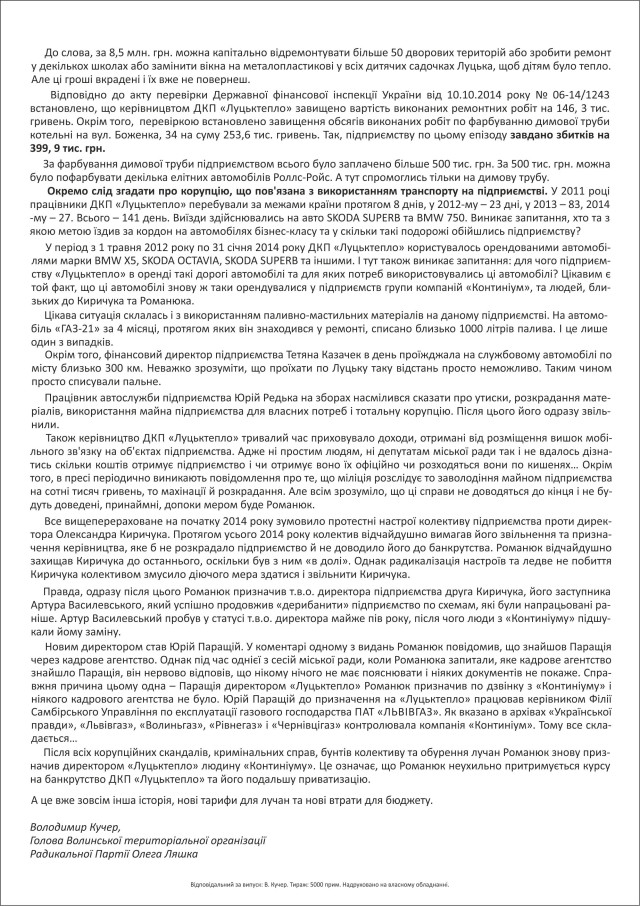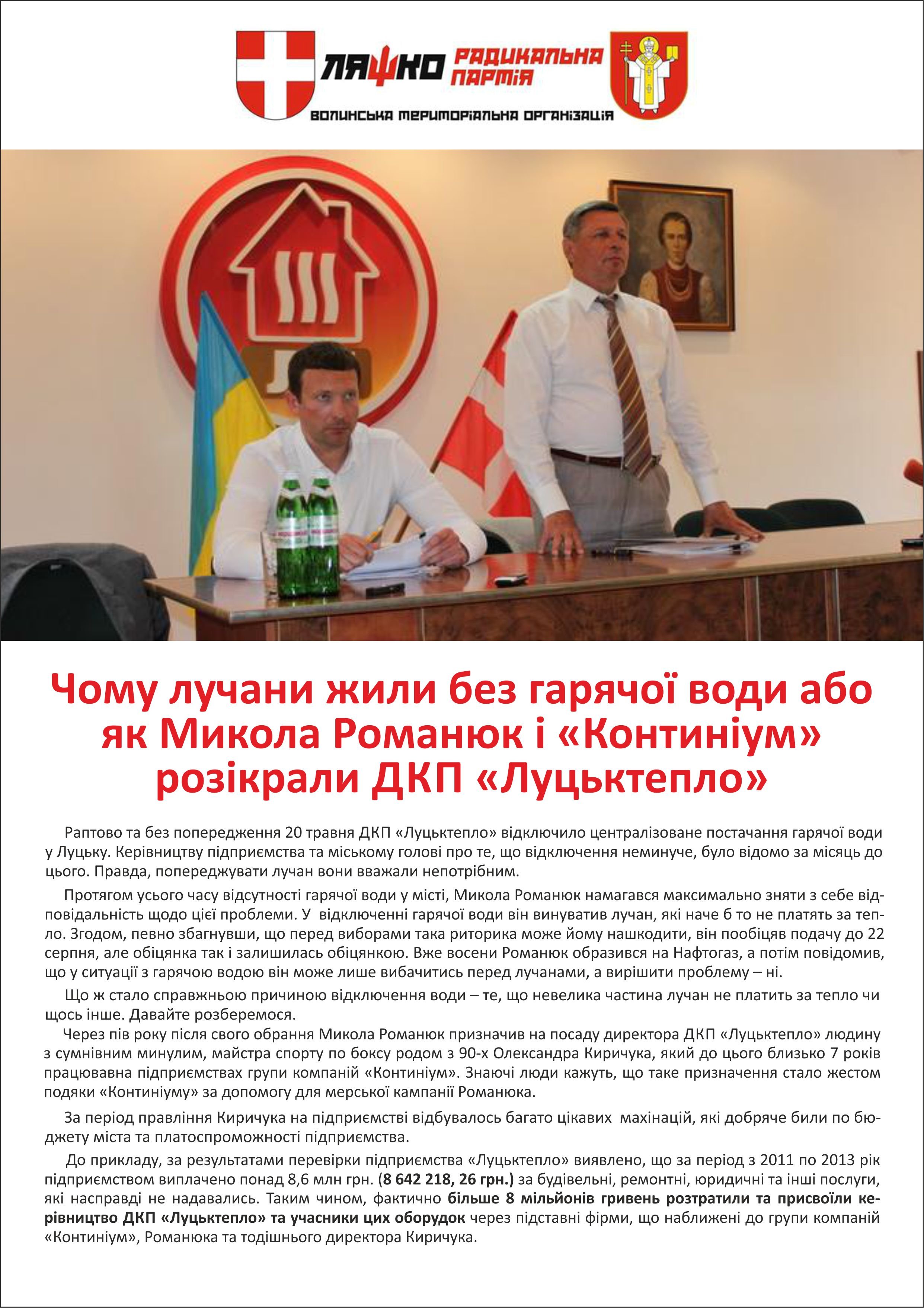 Зауважимо, текст листівки містить інформацію, яка ґрунтується на словах працівників профспілки підприємства «Луцьктепло». Вони відверто розповідають, чому і за яких обставин лучани так довго були без гарячої води, як Микола Романюк і «Континіум» розікрали ДКП «Луцьктепло».