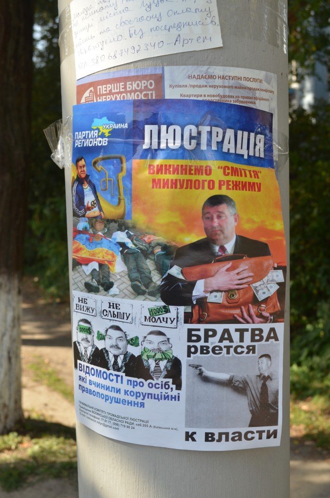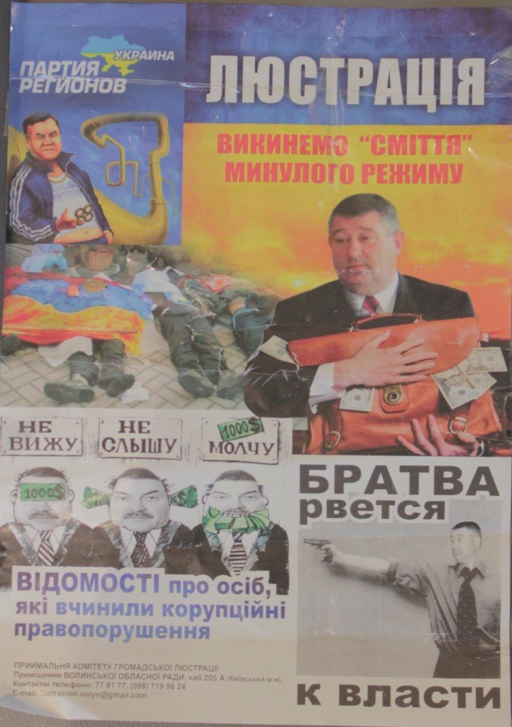 Зауважимо, що на цих листівках під назвою “Люстрація. Викинемо “сміття” минулого режиму” зображені колишні очільники Партії регіонів на Волині Олександр Башкаленко та Ігор Волошенюк. Текст листівки закликає громадян не допустити їх до влади. Крім того, в листівці зазначені контактні дані Комітету.