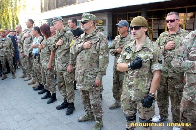 Сотні лучан прийшли на Театральний майдан міста, щоб провести на фронт своїх героїв - бійців «Айдару», які приїжджали додому у відпустки та на лікування. Тут і жаль, тут і сльози, бійців проводжають напутніми словами священиків і дитячими віршами. На майдані атмосфера урочиста і важка.