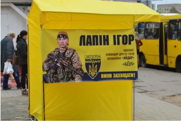 Тож Ігор Лапін - уже кандидат. Посада військового командира в «Айдарі» тепер працює на створення його іміджу перед виборцями. На його кампанію працюють найкращі представники «Самооборони Волині», які, подейкують, побили горшки з волинським «Правим сектором». Раз по раз на підтримку Лапіна до Луцька наїжджають відомі політики, громадські та військові діячі, які теж ідуть до Верховної Ради від «Народного фронту».