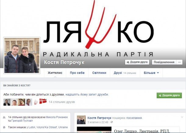 Донедавна всюди позиціонував себе як люблячий чоловік, щасливий батько та щирий товариш. Однак від травня світогляд користувача міняється в усіх соцмережах одночасно. З цього часу там можна побачити усю силу любові кандидата до партійного поводиря з вилами. Ба більше, на персональній сторінці Петрочука Вконтакті на аватарі - портрет лідера партії Олега Ляшка. У одній з соціальних мереж на головній світлині кандидат в обіймах із дружиною на фоні прізвища партійного лідера. Новинна стрічка рясніє агітінформацією в стилі Радикальної партії та патріотичними статтями. Кілька передруків зі сторінок однопартійців і жодного слова про самого Петрочука.