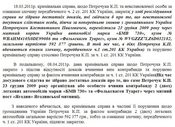 Отож, кримінальну справу стосовно Костянтина Петрочука за фактом вчинення контрабанди легкових автомобілів, таки порушили у 2011 році. Ця справа потрапила у поле зору самого керівника Відділу по боротьбі з корупцією і організованою злочинністю УСБУ Волині.