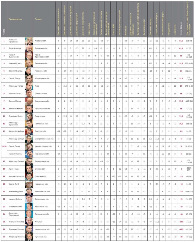 Порівняно із попереднім рейтингом суттєво змінилися позиції багатьох губернаторів. «Але сталося це не тому, що якимось керівникам вдалося досягнути видатних результатів, а насамперед через помітне погіршення соціально-економічної ситуації в низці регіонів упродовж останнього кварталу минулого року», - констатувало видання.