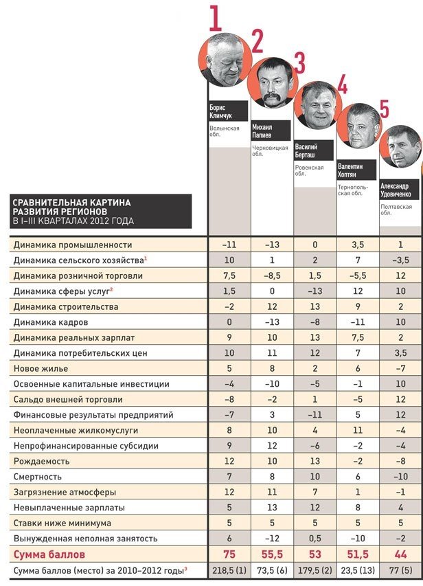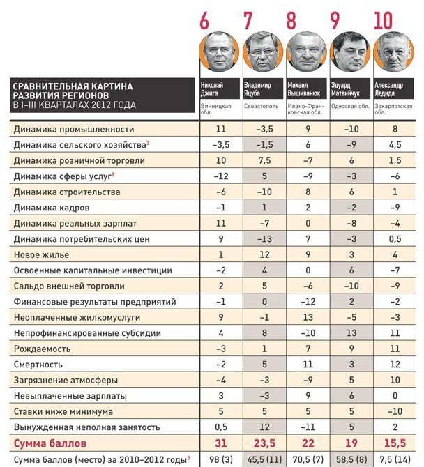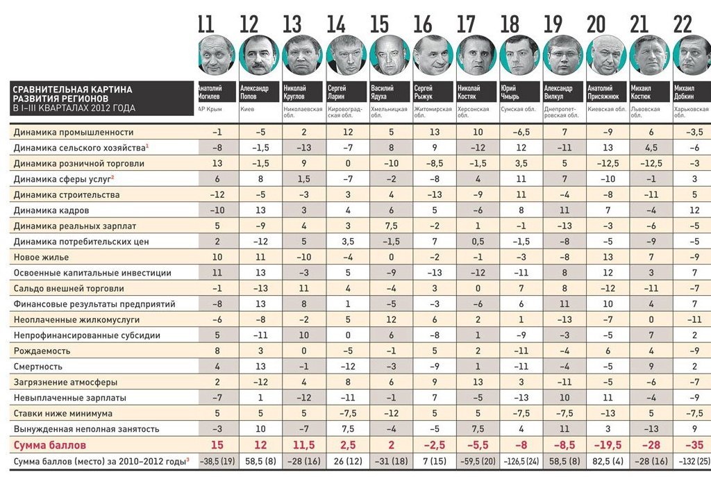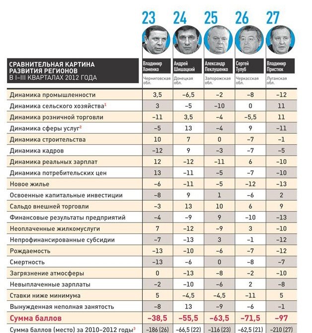 Тож, у дванадцяти керівників ця сума виявилася негативною, і це говорить про те, що ввірені їм регіони в 2010-2012 роках за 20-ма критеріями у більше відносилися до аутсайдерів, ніж до лідерів.