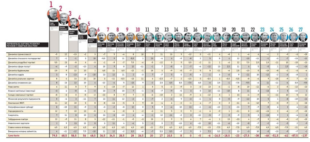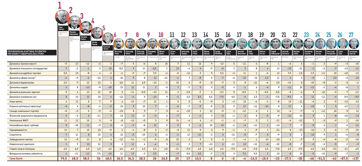 У цій ситуації не дивно, що успіхи навіть тих регіонів, які за інтегральною оцінкою розвитку опинилися нагорі рейтингу, можна назвати не більше ніж скромними, тоді як внизу таблиці накопичилася маса негативу. Губернатори, звичайно, не стануть говорити, що винен уряд. Вони люди підневільні й якщо і будуть когось звинувачувати, то газету, яка, мовляв, склала необ’єктивний рейтинг. Цей рейтинг складено винятково на основі даних Держстату та його територіальних органів (про методику коротко йдеться в довідці).