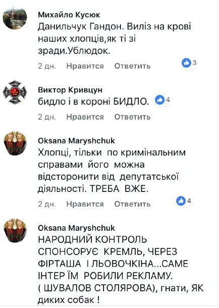 Alex Kutuzov: Те, що Данильчук збиває гроші це точно, ним пора давно вже зайнятися правоохороним органам. Де взяв бабла на квартиру, автомобіль, на весілля, чи дружина в універі на хабарях заробила? Підприємці, а чому ви мовчите? Коли в 2014 з вас Данильчук бабло збивав і автоматом тикав, чи п*па жим-жим? І депутатом він став, щоб уникнути відповідальності за свої діяння.