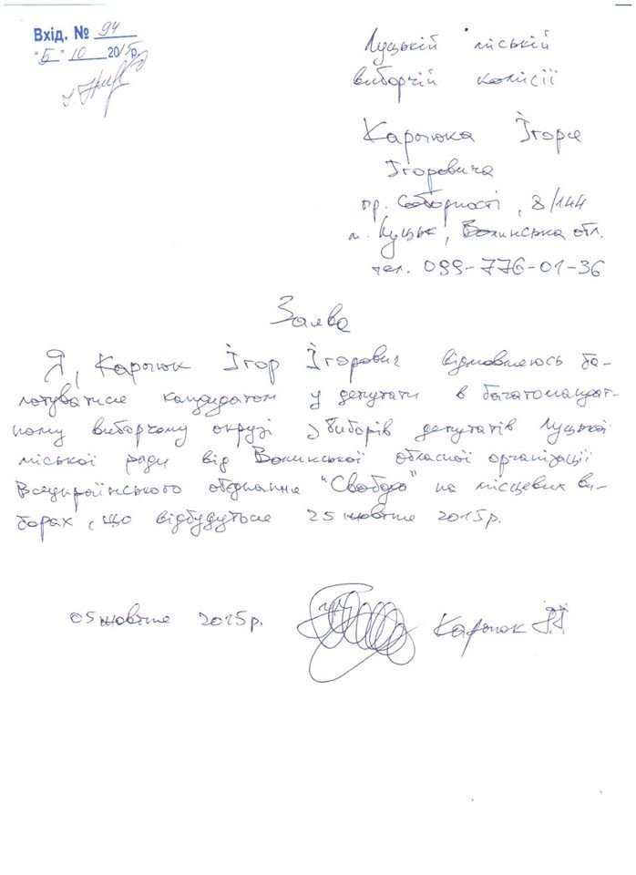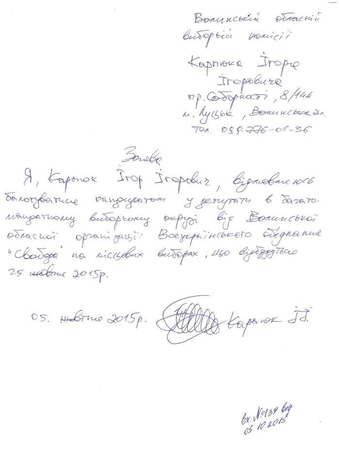 Так, Ігор Карпюк не балотуватиметься кандидатом у Волинську обласну раду у виборчому окрузі №59 та кандидатом у Луцьку міську раду у виборчому окрузі №37 від ВО «Свобода». Відповідну заяву про відкликання заяви про згоду балотуватися кандидатом у депутати Ігор Карпюк надав до Волинської обласної виборчої комісії та Луцької міської виборчої комісії у понеділок, 5 жовтня.