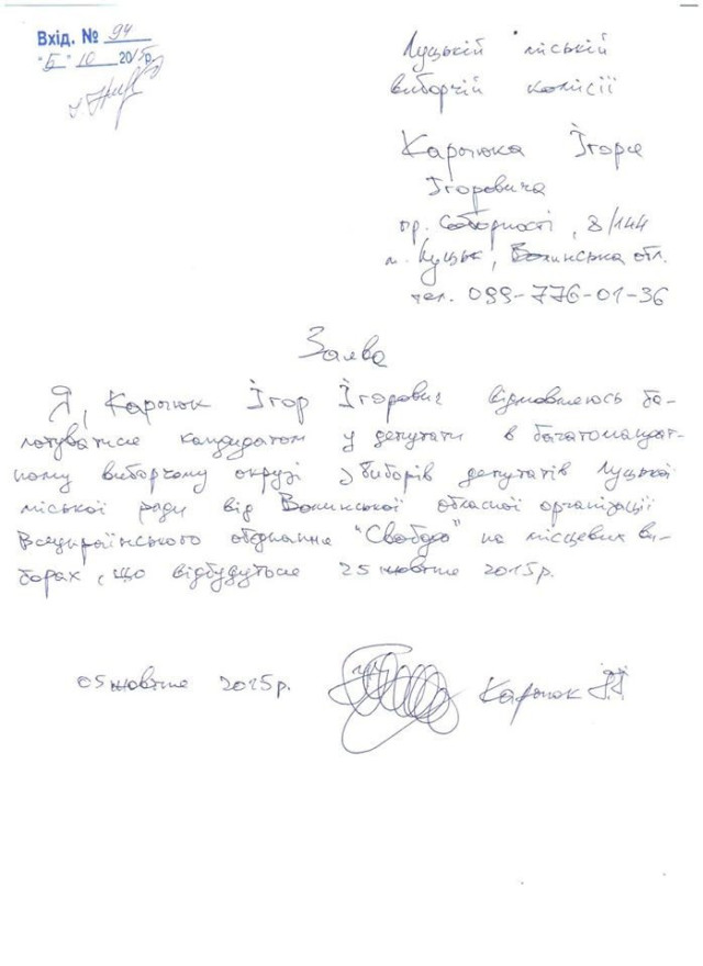 Рішення про виключення Карпюка прийняли 5 жовтня у зв’язку з подачею недостовірної інформації керівництву партійної організації про його політичне минуле, ‒ повідомляє у Facebook перший у списку кандидат у депутати міськради від ВО «Свобода» Микола Федік.
