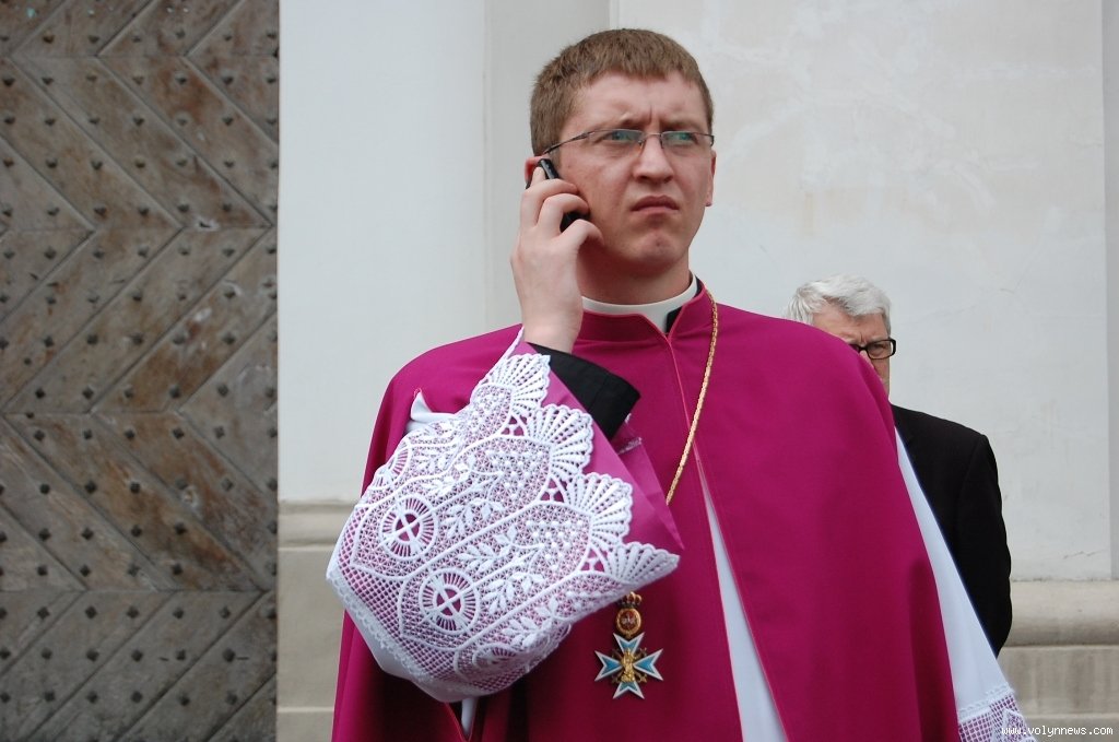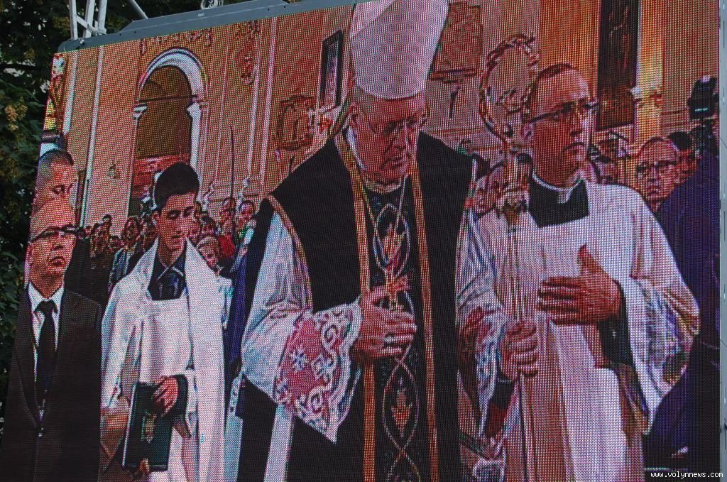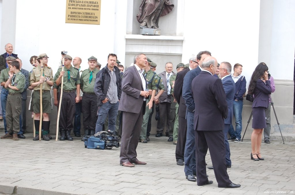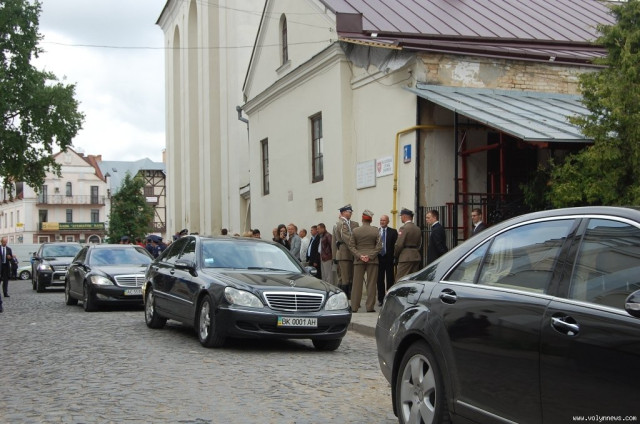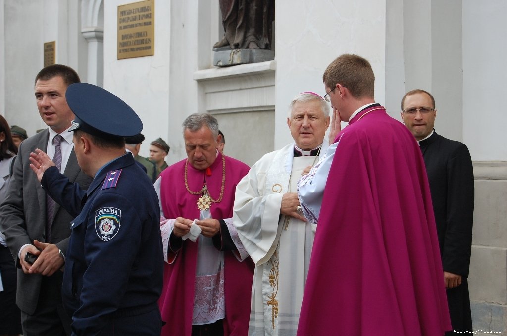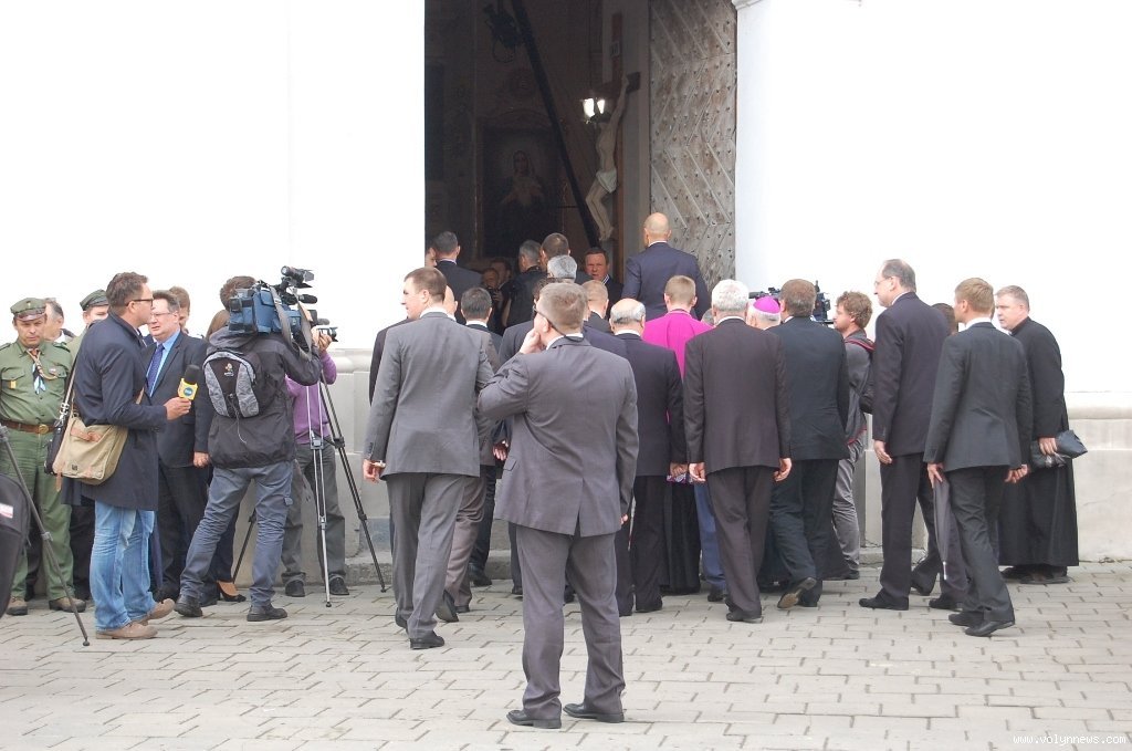 Високопосадовці прибули до Кафедрального католицького костелу Святих Апостолів Петра і Павла, що у Луцьку, приблизно о 10:45, 14 липня.