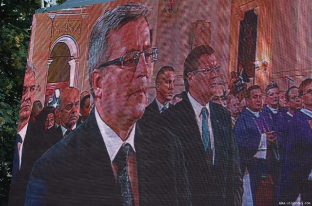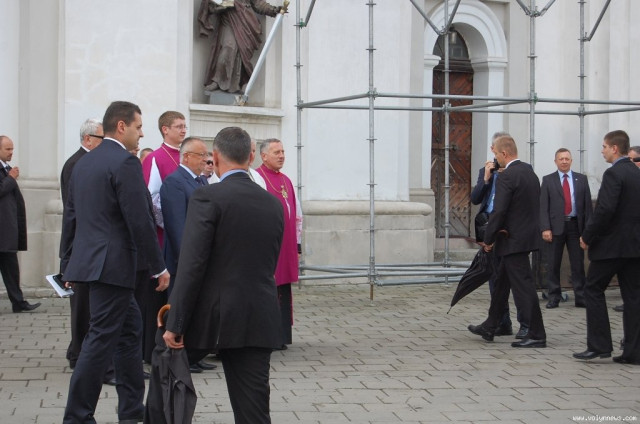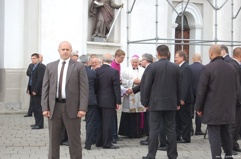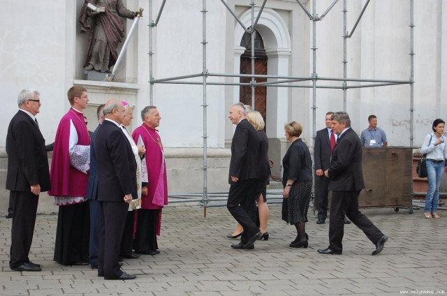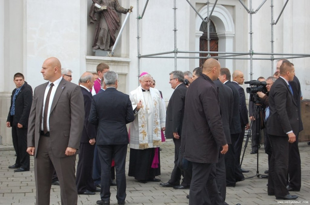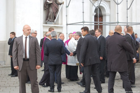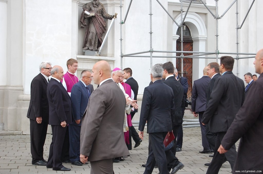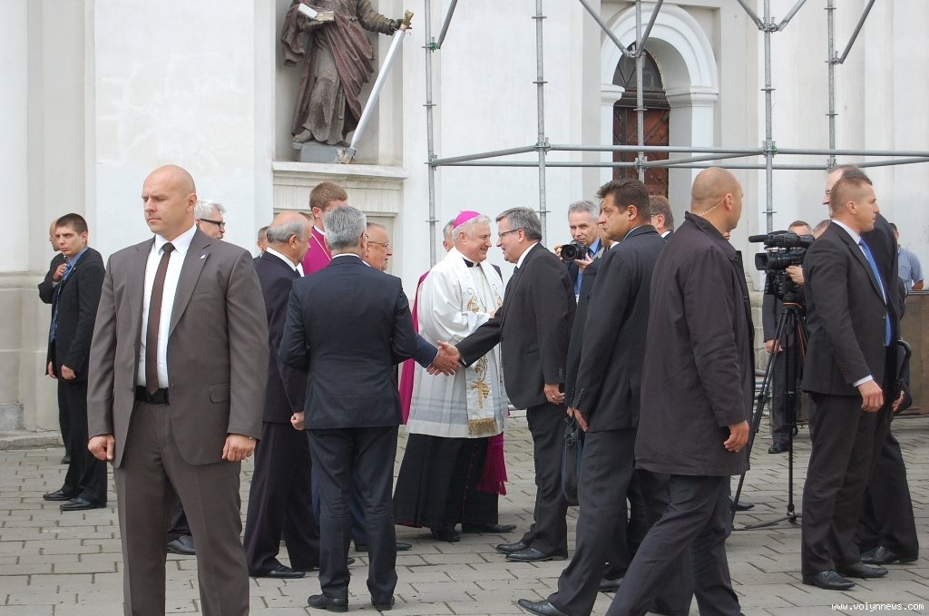 Через деякий час після цих слів до костелу підійшли Броніслав Коморовський та Костянтин Грищенко у супроводі охорони. До слова, окрім особистої охорони, безпеку високопосадовців берегли й правоохоронці й «силовики», які просили людей зійти з проїжджої частини на пішохідні тротуари.