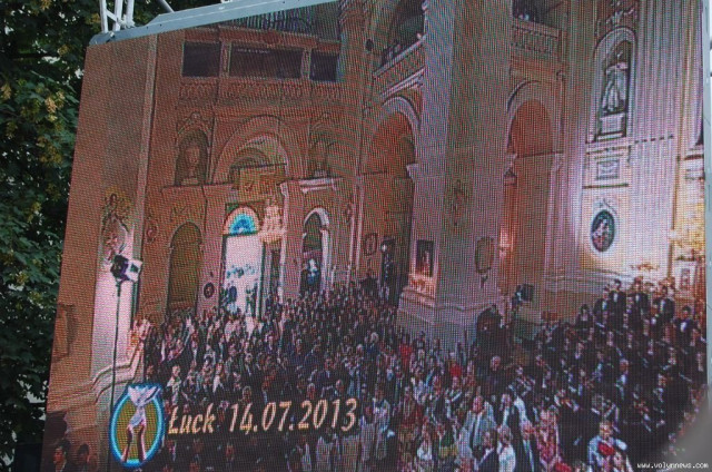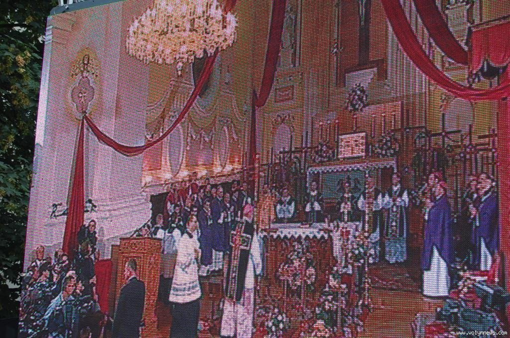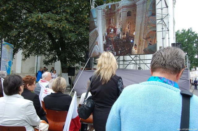 За словами очевидців, люди у храмі почали збиратися ще орієнтовно о 10 годині. Пускали у приміщення костелу не всіх, але для охочих взяти участь у богослужінні на Замковій площі встановили екран, на якому можна було побачити трансляцію літургії з храму. Варто зазначити, що люди на площі були з польськими прапорами.
