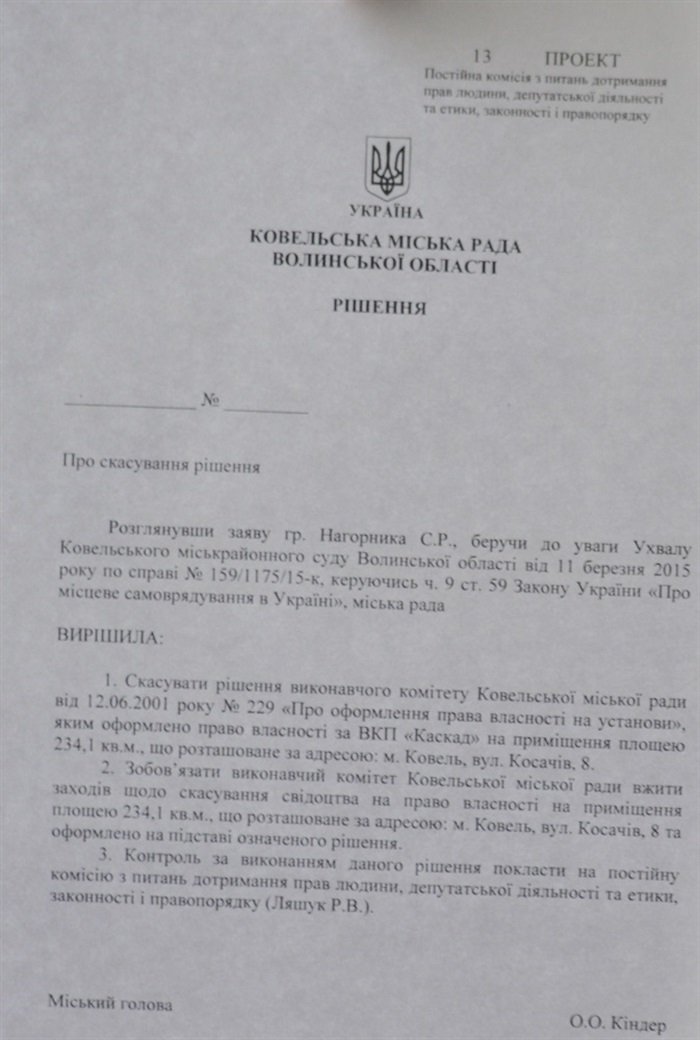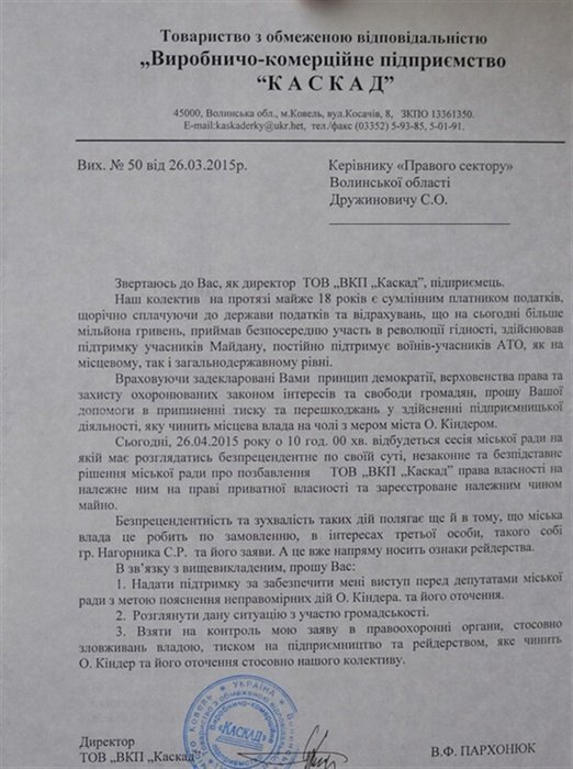 Під час засідання 69-ї сесії Ковельської міської ради, жителі міста попросили дати слово депутату Володимиру Пархонюку. Обранець громади вийшов до трибуним, а разом з ним і декілька десятків обурених ковельчан. Зі слів депутата, міська влада на чолі з Кіндером збираються рейдерським способом захопити приміщення ТОВ «ВКП Каскад». Пархонюк запропонував розглянути питання, яке їх хвилює першим у порядку денному.