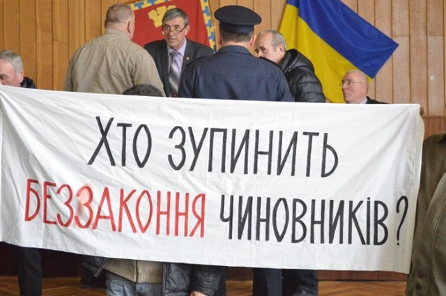 Обурені люди тримають плакати «Хто зупинить беззаконня чиновників?» та «Кіндер, досить нам сюрпризів».