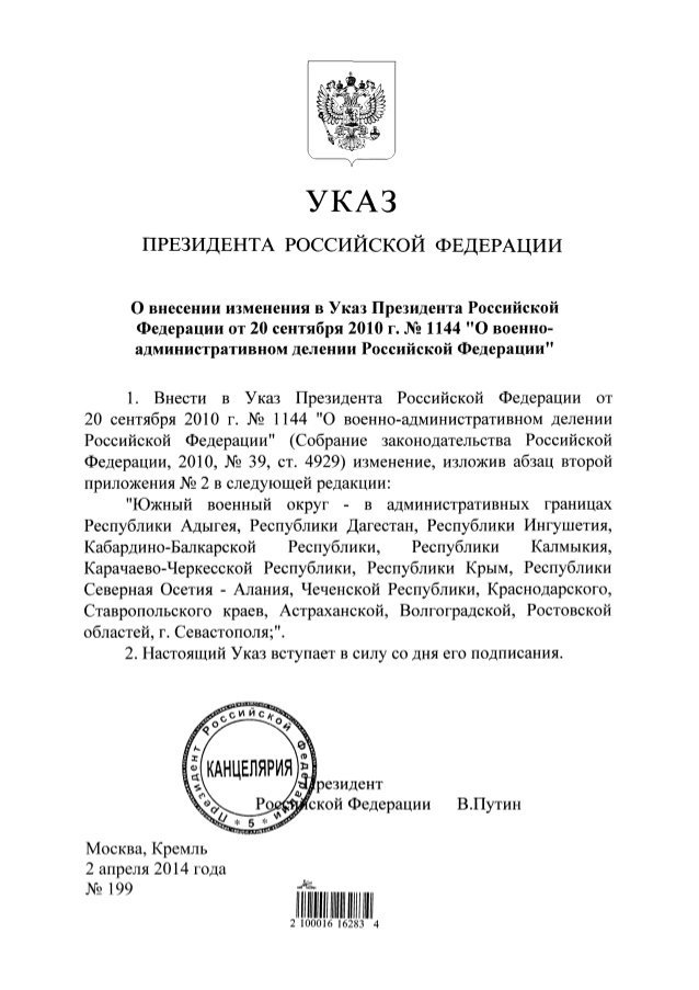 Указ, згідно з яким Крим включений до складу Південного військового округу, підписав президент Російської Федерації Володимир Путін.