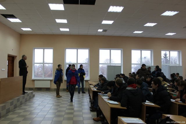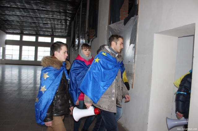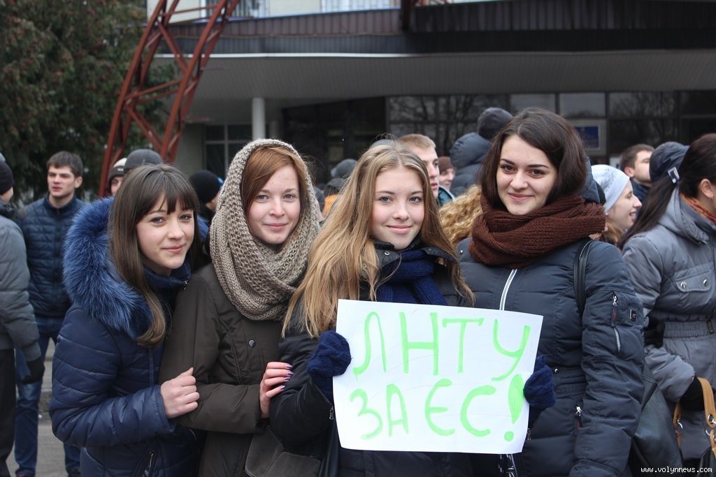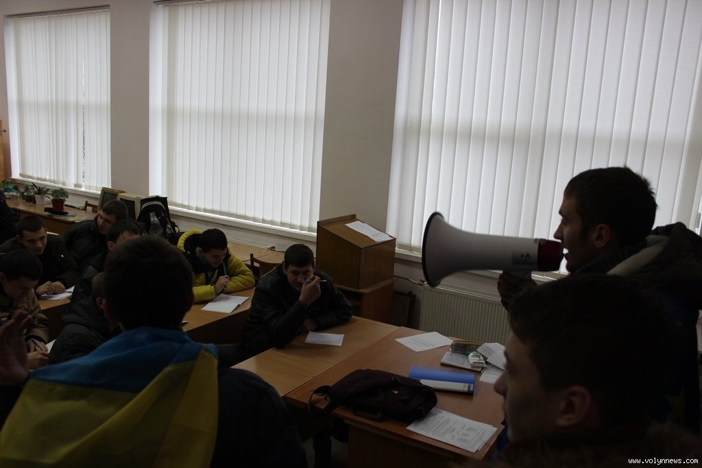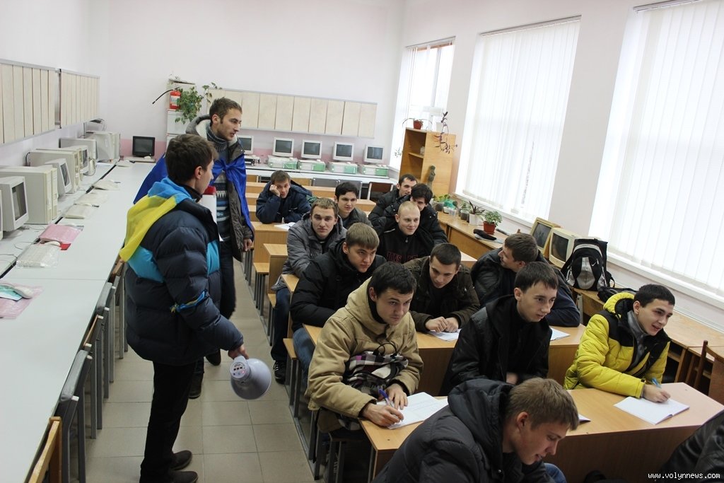 Сьогоднійшній ранок в Луцькому національному технічному університеті по-справжньому революційний. Принаймні, для студентів. Уже з початком першого заняття групи активістів з рупорами збирали студентів по аудиторіях, закликаючи вирушити колоною до головного майдану міста - Театрального.