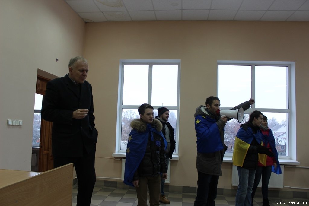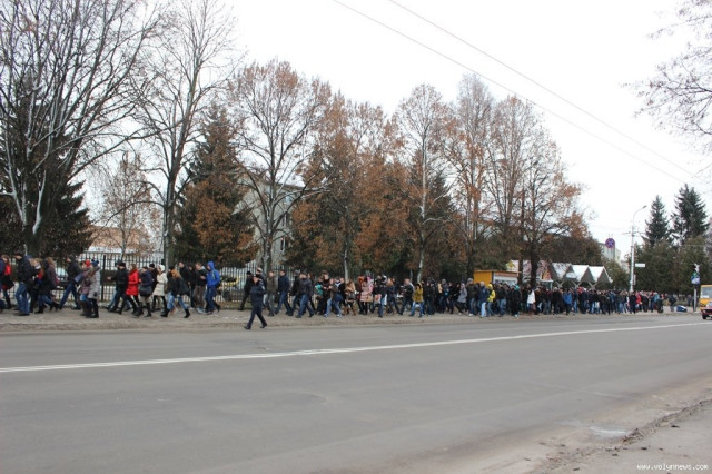 Уже о 10.00 декількасот студентів, організованих активістами, скандуючи «Революція!», вирушили колоною по вулиці Львівській до центру Луцька. Колону супроводжують 6-7 міліціонерів і одна машина правоохоронців.
