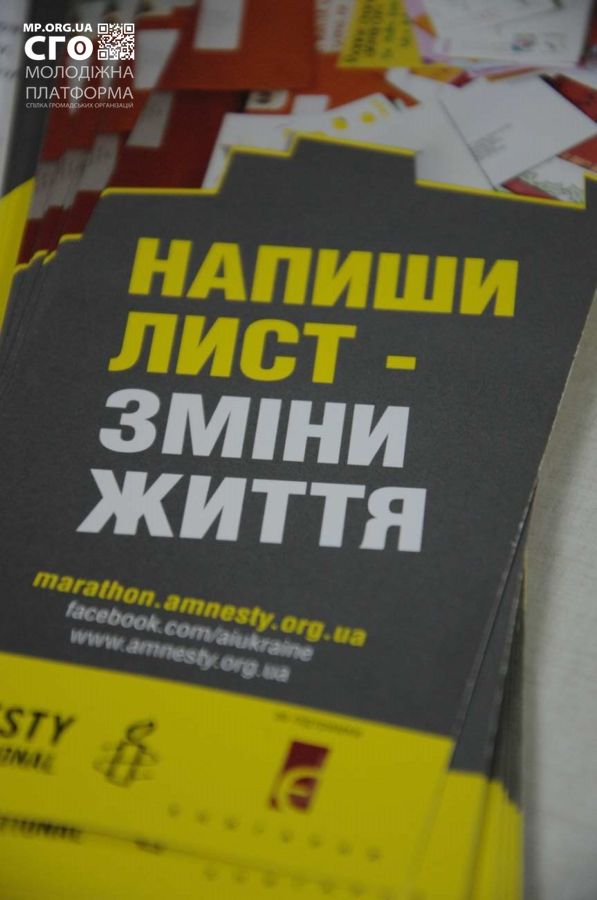 Довідка: перший Марафон написання листів у Amnesty International відбувся 11 років тому в Польщі після того, як координатор місцевої групи у Варшаві зустрів дівчину, яка описала йому, як вона організувала в Африці 24‑годинний захід з написання листів-протестів урядам. Група вирішила писати листи протягом 24 годин, а потім підрахувати, скільки листів буде написано. Вони поширили ідею серед інших польських груп, і врешті-решт вона об'єднала активістів у всій країні. Вони поділилися ідеєю з іншими офісами Amnesty у всьому світі і так акція стала глобальною. Марафон написання листів розпочався.