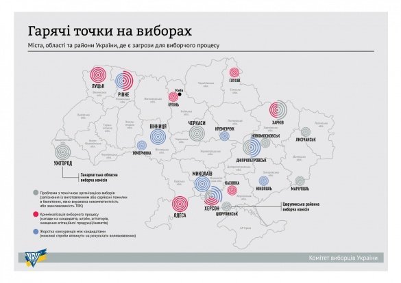 Комітет виборців України склав мапу "гарячих точок". У цих населених пунктах зафіксували серйозні проблеми із ходом виборчого процесу. Там були проблеми із технічною організацією виборів, криміналізацією виборчого процесу та жорсткою конкуренцією між кандидатами. У чотирьох містах зафіксовано проблеми одразу за кількома параметрами. До таких міст належать Дніпропетровськ, Харків, Рівне та Херсон.