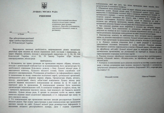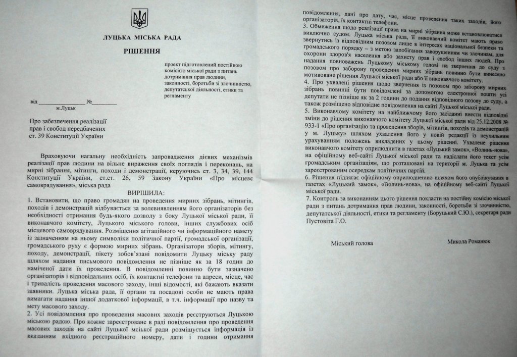 Нагадаємо, що 7 червня 2012 року виконавчий комітет Луцької міськради ухвалив рішення, яким вніс зміни до свого іншого рішення №933-1від 25 грудня 2008 року «Про організацію та проведення зборів, мітингів, походів та демонстрацій у м. Луцьку». В одному із пунктів ухваленого рішення зазначено, що «повідомлення про проведення зборів, мітингу, походу або демонстрацій надається організатором письмово, до Луцької міської ради не пізніше як за 4 дні до наміченої дати їх проведення».
