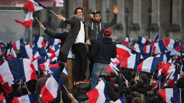 У штабі Макрона почали святкувати перемогу ще до закінчення підрахунку голосів. Його прихильники зібралися біля Лувру у центрі Парижа, згодом до них приєднався й Еммануель Макрон.