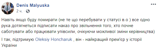 "Навіть якщо буду вмирати (не те що перебувати в статусі в.о.) все одно рука дотягнеться підписати наказ про звільнення того, хто почне саботувати або працювати у півсили, чекаючи можливої зміни керівництва", - написав міністр у соцмережі, проілюструвавши заяву фото, на якому видно лише руку Малюська з-під столу.